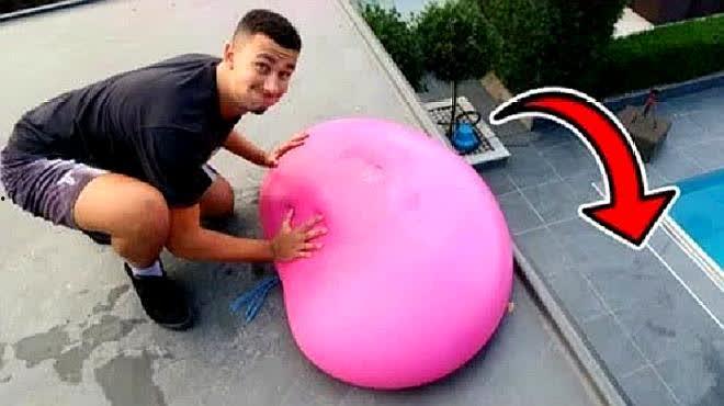 男子脚踩水气球,挑战极限
